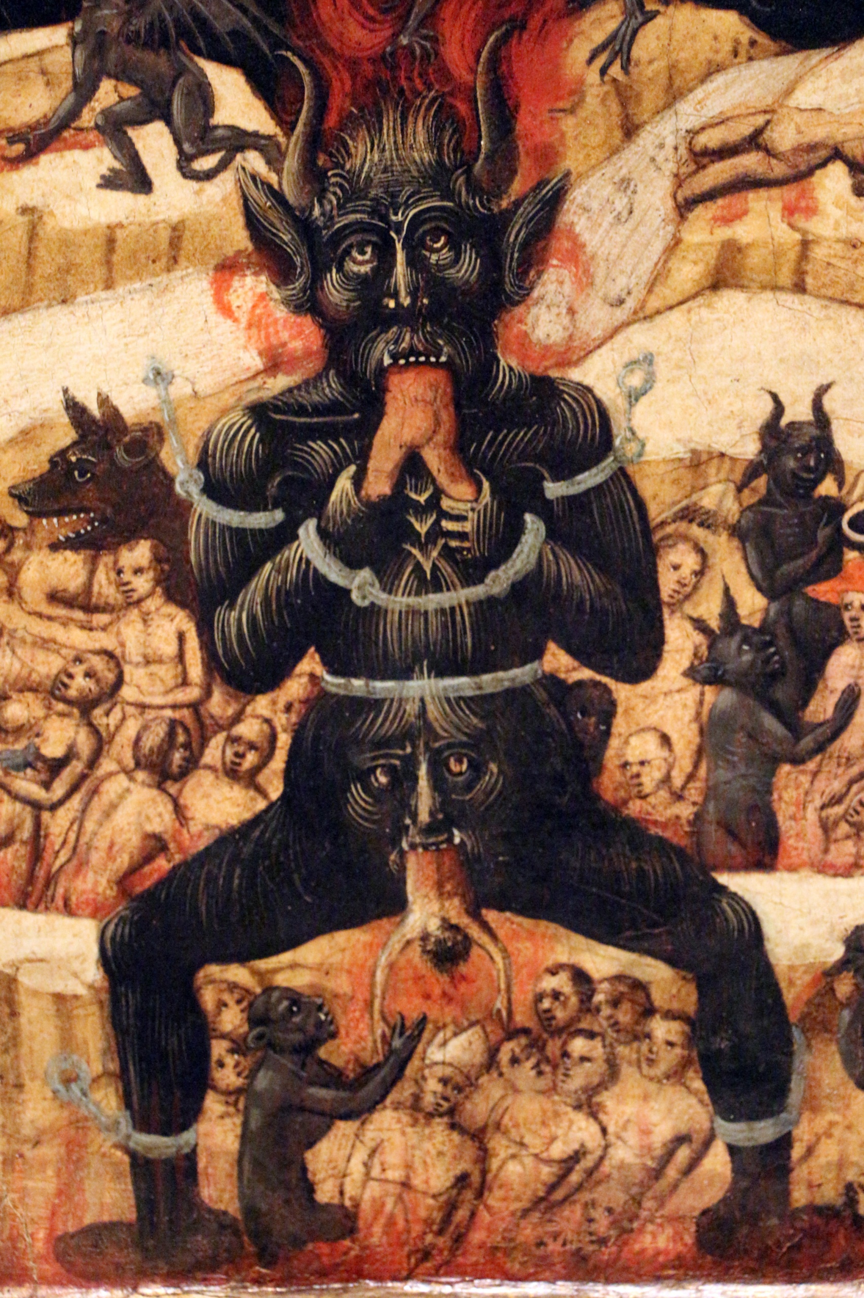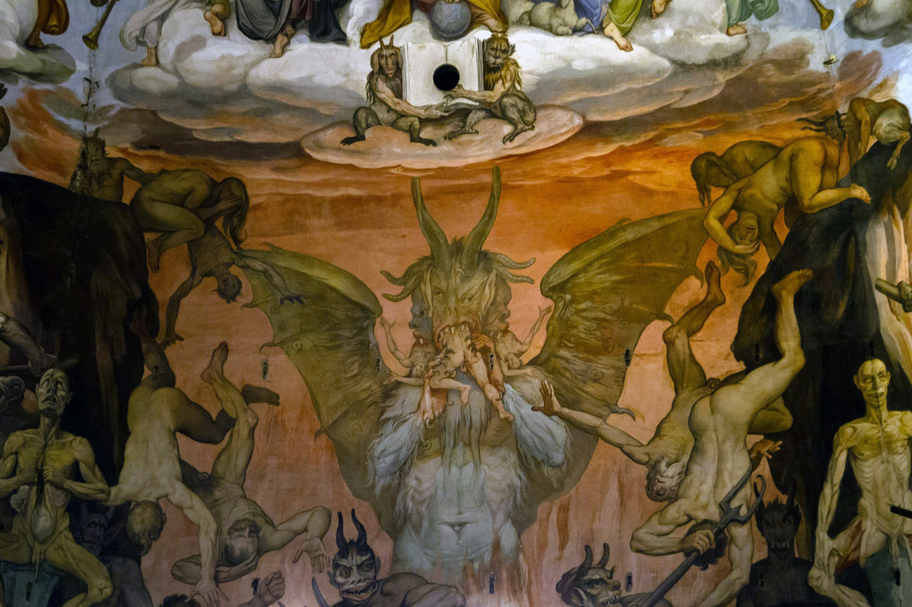 L’enfer est divisé en 4 niveaux avec une gradation des châtiments infligés aux damnés. Parmi les pécheurs, on reconnait les femmes infanticides, les juifs dotés de chapeaux pointus et Lucifer lui-même sur son trône.