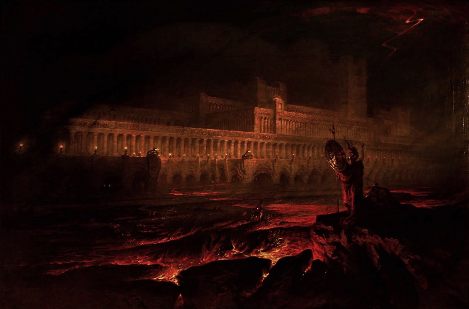 En 1667, John Milton écrit « Le Paradis Perdu » un poème épique racontant la chute de Lucifer. Dès sa parution, l’œuvre connait un grand succès et des peintres s’en inspirent jusqu’au XIXeme siècle. Le tableau de John Martin représente le Pandémonium, mot inventé par Milton. Dans le poème, le Pandémonium est la capitale des Enfers où Satan gouverne son peuple démoniaque. De dos, contemplant son royaume, le diable est en armure et casqué tel un général de guerre.