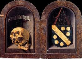 En 1452, le Triptyque Braque par Roger van der Weyden est considérée comme la première Vanité. À l’envers d’un retable, un crâne et une brique ébréchée, images de la fragilité de l’existence, sont représentés.