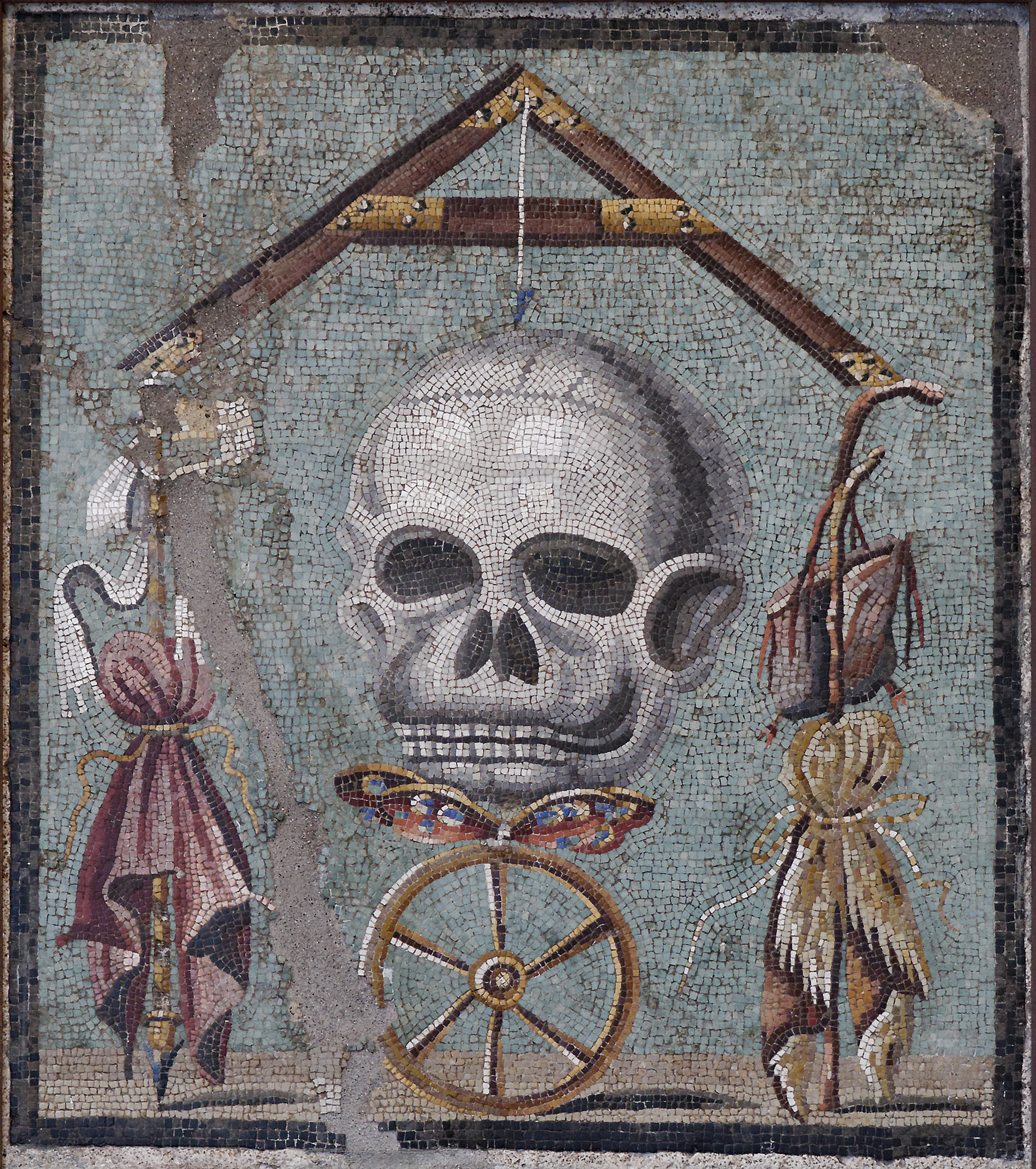 Des fresques antiques affichent la figure du crâne, symbole universel de la mort. Associé avec le papillon, symbole de l’âme, il est présent dans les mosaïques qui ornent les maisons.